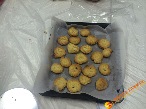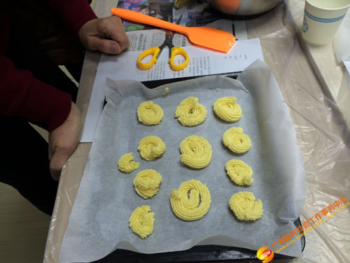 在等待戚风蛋糕出炉时,义工们又共同制作“牛油曲奇”,义工们一边制作,一边分享烘焙经验,义工们共同交流,相互协助,很快就完成了两盘曲奇饼。