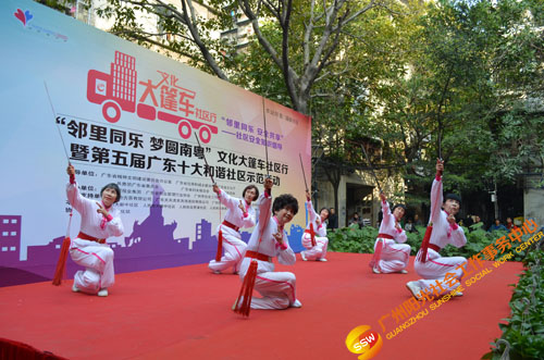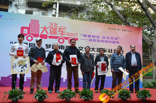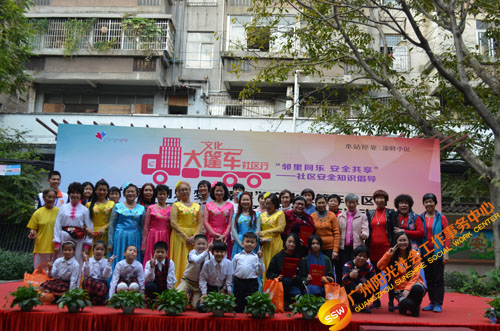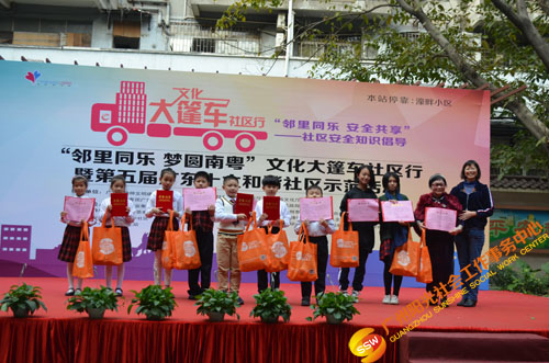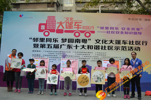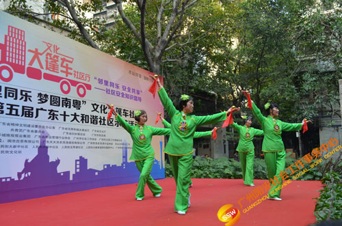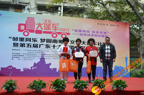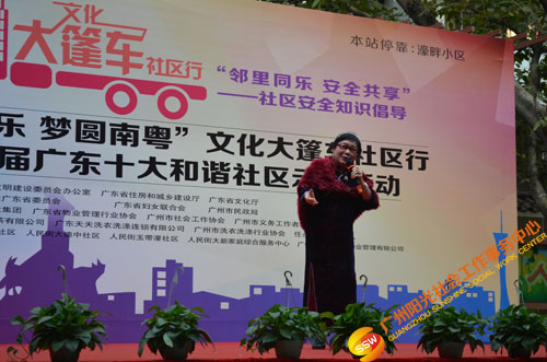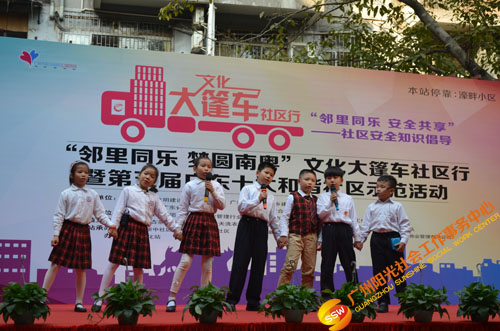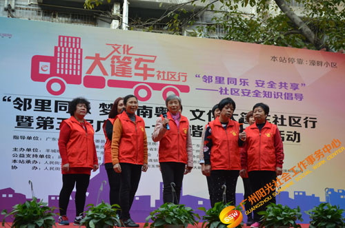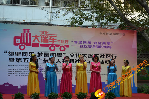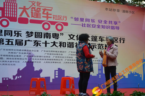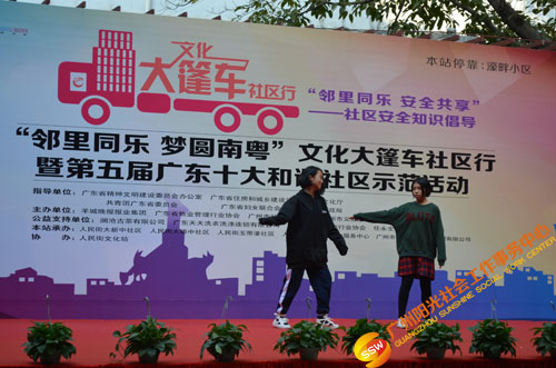 原来是在开展文化大新社区SHOW——第四届社区安全知识倡导活动(以下简称社区剧场)暨“邻里同乐,安全共享”——濠畔智慧小区文化大篷车颁奖典礼(以下简称大篷车活动)。大篷车由人民街大新综合服务中心,联合人民街道办事处、人民街文化站、广州市佳宁高科物业管理有限公司、大新中社区居委、大德中社区居委、玉带濠社区居委
