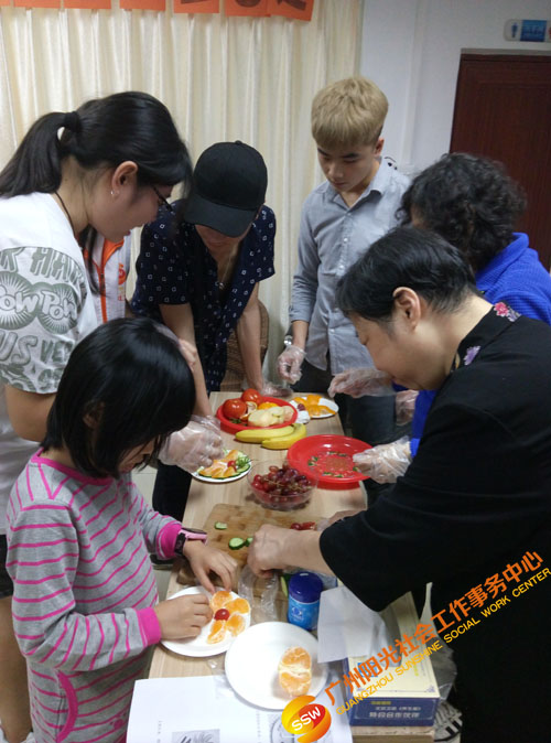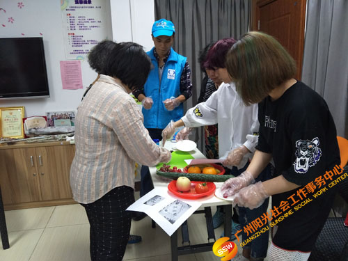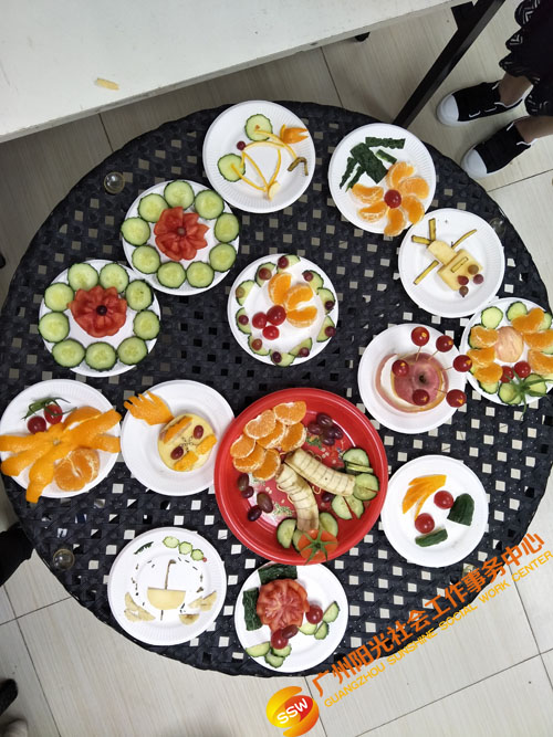 热身游戏环节过后,进入“水果拼盘制作”环节。义工们分为两组,组内自由分工,合作制作水果拼盘;义工分工明确,有的义工负责切水果,有的义工负责摆盘……最后在相互的合作下,制作出创意的水果拼盘;义工们还为自己创作的作品命名并分享自己的创意灵感,促进义工的交流与互动。