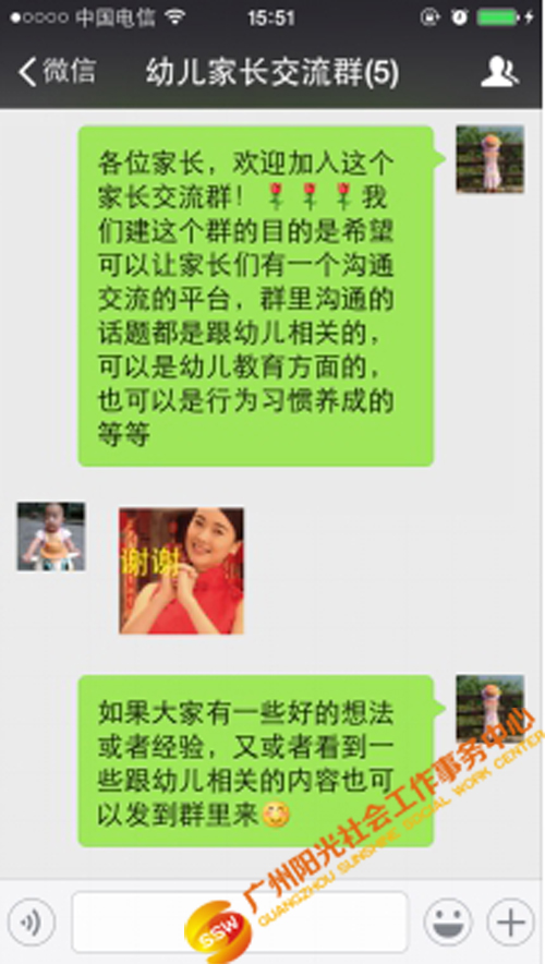 小组共开展了8节,主要是通过组织家长们一起学习育儿的相关知识(比如说:小儿秋季腹泻、小儿咳嗽的预防和治疗、宝宝居家安全小知识和如何让宝宝远离蚊叮虫咬等),促进社区内同龄幼儿家长相互间的沟通和交流,家长们都觉得这样的方式挺好,小朋友开心大人也有收获,为了让这种沟通和交流可以持续下去,社工建立了一个幼儿家长交流微信群,让家长们可以在微信群里得到支持,也可以将自己看到跟幼儿相关的好的文章或者是育儿知识等资讯发到群里跟其他家长共享。