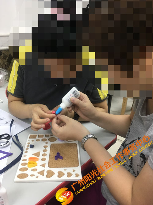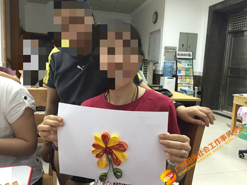 接下来,社工让学员用今天学到的四种卷纸方法自由创作,完成本节小组第一幅卷纸画成品。在这个过程中,社工发现有些成员喜欢用色彩丰富的纸条,而有些成员喜欢用单一色彩的纸条,但他们都有自己的一种拼贴方法。小组成员在遇到困难时也会主动找社工或者义工姐姐帮忙,并且能够做到互相帮助,体现互助互爱的精神。
