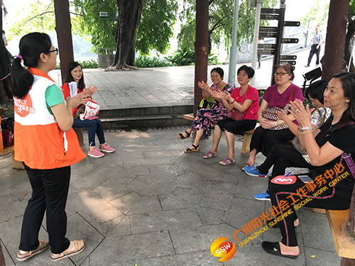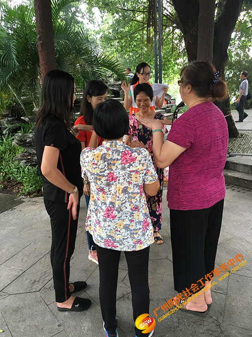 活动开始前,社工与义工凉亭围坐闲谈自己最近一些有趣的见闻。活动正式开始,社工带领大家以讲故事的形式玩了抓虫虫的热身游戏,充分带动了义工参与活动的热情和现场活跃的氛围。