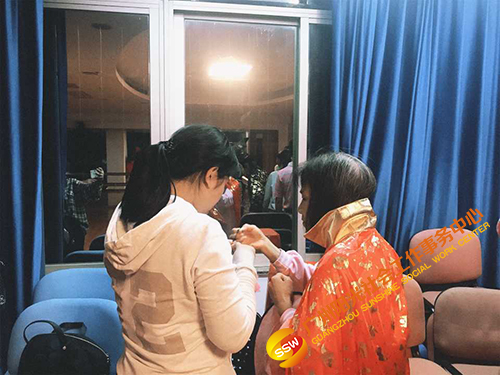 义工间互相帮忙精心打扮