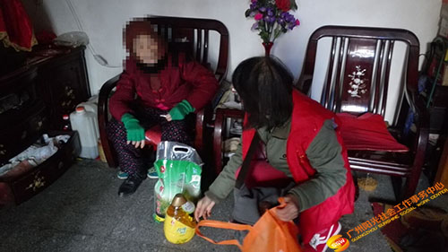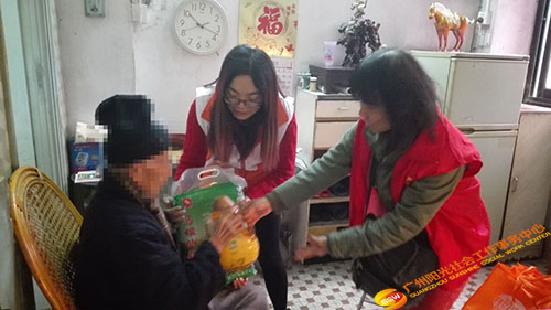 10斤大米和一支食用油对于特殊长者来讲是一件雪中送碳的事情,因为他们年龄较大且身体原因,无法下楼买菜煮饭,造成生活的一定困扰。2016年2月人民街家庭综合服务中心、人民街大新家庭综合服务中心参加越秀区民政局组织的“义工送暖迎信念,福泽越秀进万家”活动,面向辖区内10名独居高龄、边缘困难长者,组织义工派送慰问礼品包,表示社区节日的祝福。