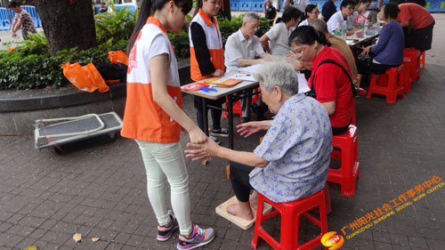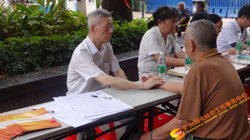 2016年5月27日早上人民街家庭综合服务中心长者部社工在海珠东广场开展了“健康齐关注”社区义诊活动。此次义诊联合人民街社区医院和退休的叶医生共同为居民提供大肠癌筛查登记、传染病预防宣传、血压测量、按摩体验和中医打脉五大方面的服务。