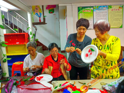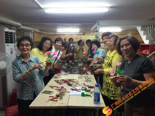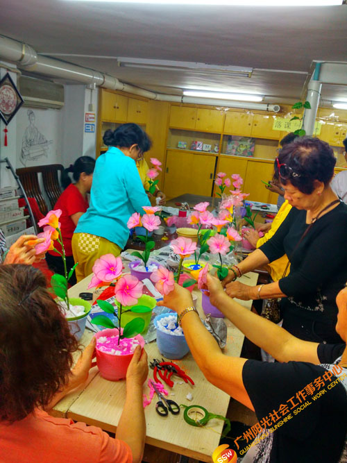 2016年5月23号下午社工在人民街家庭综合服务中心的靖海门分点圆满结束了“丝丝心意”丝网花小组。本小组持续一个多月,共六节。该小组邀请了擅长丝网花的阿姨进行义教,指导组员掌握并完成每个丝网花成品,在这个过程中,使得组员学得开心、聊得开心、玩得开心,从而促进了长者之间的互动,同时共产出60个义卖作品。