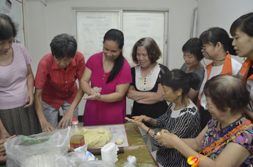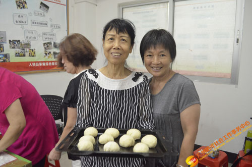 在小组开始前社工带领长者互相介绍自己,待组员熟悉后,由西点制作达人雷姨教长者们学习“原味面包”。首先雷姨为大家简单介绍制作步骤,从食品的添加成分,到揉面技巧,循序渐进的讲解模式,不少长者们自带笔记本记录下 “老师”所教的知识点。整个小组过程中组员们都认真听讲,思考学习内容,接着长者们逐一亲手体验了一遍揉面过程,小组中有个别组员没有理解怎么做的,其他热心组员也积极帮助,短短两个小时,从制作面胚到进烤箱,组员们都积极参与,活跃度高,同时能协助身边的组员,共同进步。