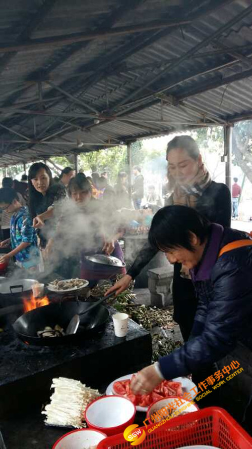 在本活动中,野炊是重头戏。10名义工首先平均分成两组,每组派一位代表通过“石头剪刀布”的游戏来赢取食物。在烹饪过程中,每位义工都纷纷发挥所长,有人搬材,有人洗菜,有人煮汤,有人炒菜,活动现场好不热闹!经过所有人的共同努力,九菜一汤呈现在大家面前,每个人都放松心情,一边享受美食,一边互相交流。