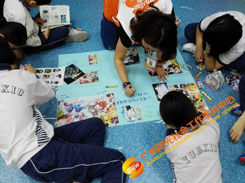 图一:通过游戏“形象代言人”提升组员的自我认识,组员与社工共同制定小组规范。